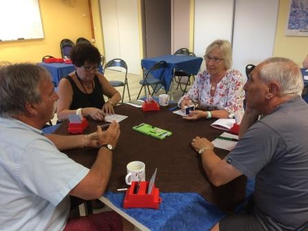 Les cours ont lieu le matin, de 10 h 00 à midi (plus le premier soir, le jour d’arrivée) et les tournois commentés le soir, de 20 h 30 à 23 h 30, avec exclusivement des donnes d’application des cours. Marc Kerlero se promène au milieu des tables pendant le tournoi, ce qui lui permet de faire ses commentaires “à chaud”. Bien entendu, chacun reçoit ensuite un livret avec le commentaire de toutes les donnes jouées, pour compléter le livret de cours distribué le matin.