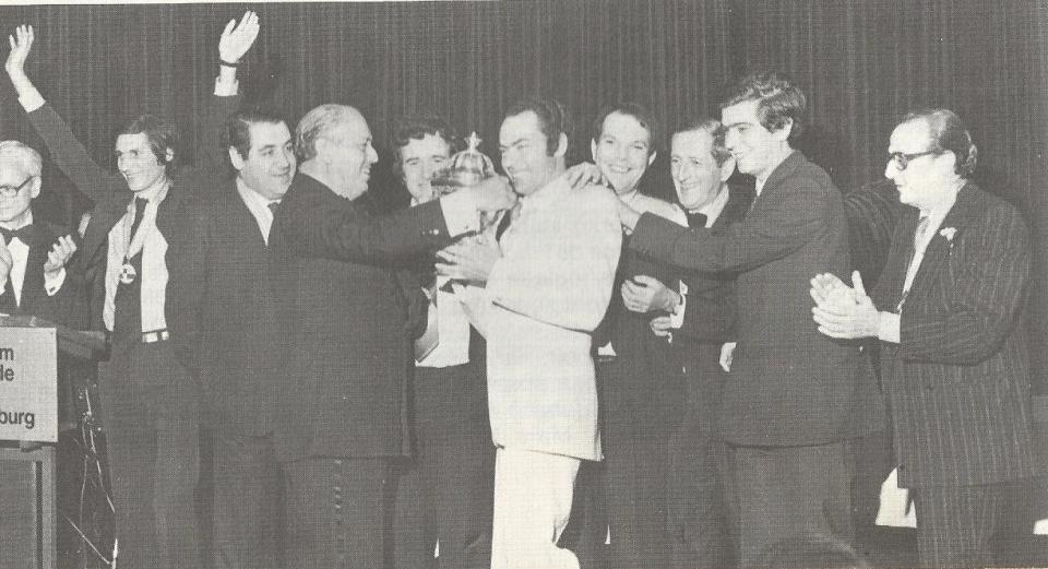 De gauche à droite : Christian Mari (les bras en l’air), Paul Chemla, Jimmy Ortiz (président de la fédération mondiale à l’époque), Michel Perron, José Damiani (tenant la coupe, président de la F.F.B de l’époque, futur président de la fédération mondiale), Michel Lebel, Henri Svarc, Philippe Soulet et enfin, Pierre Schemeil, capitaine de l’équipe de France.