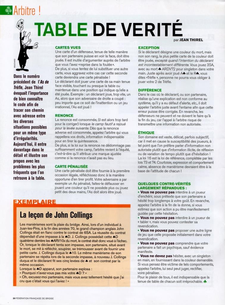 Je crois qu’il est très difficile d’être un seigneur. Mon expérience me dit que si les tricheurs sont rares à ce jeu les “casse-couilles” et les trichoteurs sont légions. Si je pense avoir une attitude correcte à la table, j’ai de plus en plus de mal a supporter certains piliers de tournoi de régularité qui ont des conventions spéciales et non alerté contre les 1 ère série, sans parler des tics signifiants ect ….. Contre ces gens la je demande à l’arbitre une stricte application du code alors que contre les autres j’aime être cool et tolérant.